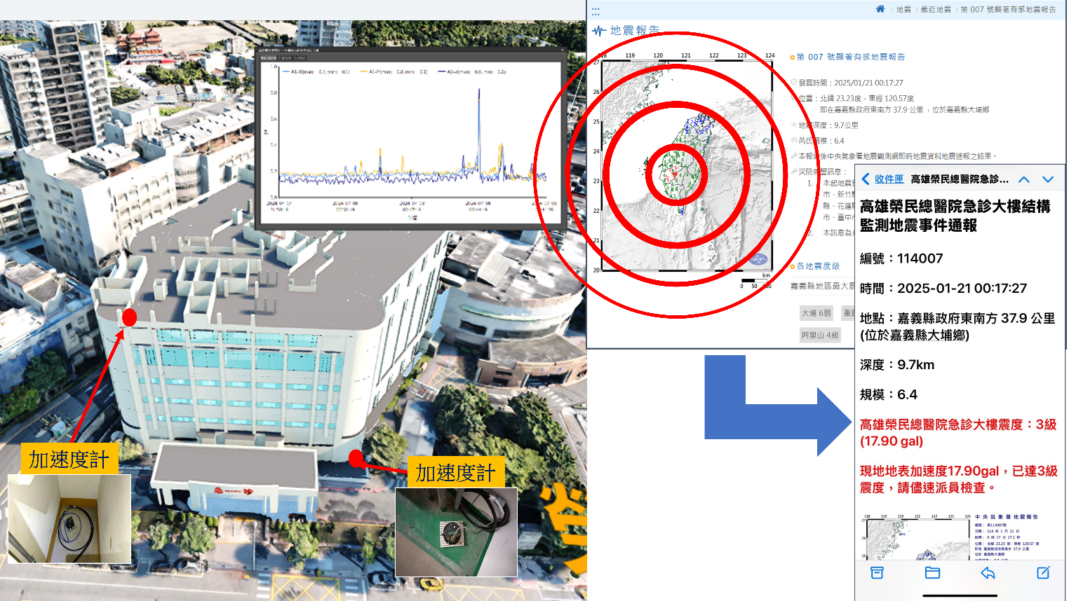 楊欽富表示,該平台透過AI演算法24小時即時監測建物結構安全,能在地震災害發生時自動通報建物安全性,震後迅速掌握受損狀況,作為後續補強與評估的重要依據。未來也可推廣至全市建物,協助市府第一時間掌握危老大樓、養老院及關鍵基礎設施是否於地震中受損,大幅提升災後救援效率與判斷準確性。平台後續將逐步擴展至工地安全監控、行道樹傾斜預警與橋梁結構安全等領域,全面導入AI技術減輕人力負擔,並強化工務緊急事件的應變能力,以科技提升城市安全與治理品質。